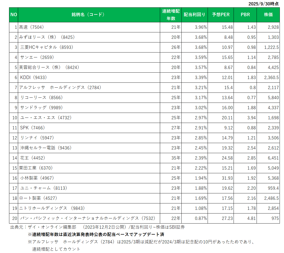 左から、銘柄名(コード)、連続増配年数、配当利回り、予想PER、PBR、株価となっており、連続増配年数が20年以上の銘柄の出典元は「ザイ・オンライン編集部 (2023年12月2日公開)」。
