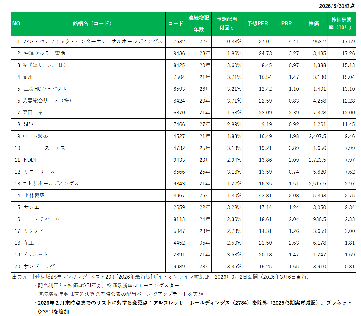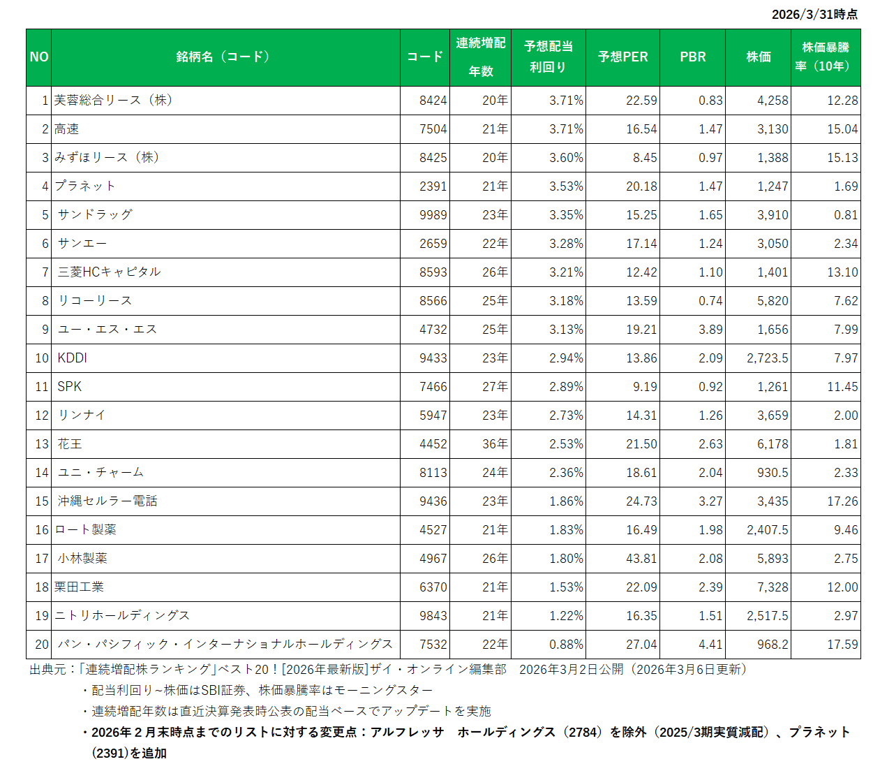 連続増配年数が20年以上の銘柄の出典元は「連続増配株ランキング」ベスト20![2026年最新版]ザイ・オンライン編集部 2026年3月2日公開(2026年3月6日更新)。