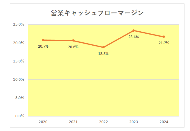 そして真の稼ぐ力を表す営業キャッシュフローマージンは2022年を除いて20%を超えており安定しています。