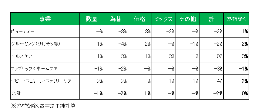 これを見ると為替(-2%)と数量減(-1%)を価格(値上げ+1%)で補えなかった状況が見て取れます。