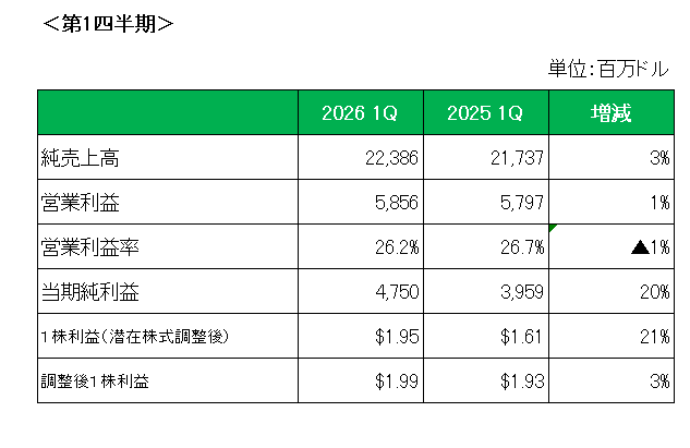 そして2025年(65億ドル)と比較し規模は縮小するものの今期は総額約50億ドルの自社株買いを実施する予定であり、第1四半期は12.5億ドルの自社株買いを実施、株主還元重視の姿勢に変更はありません。