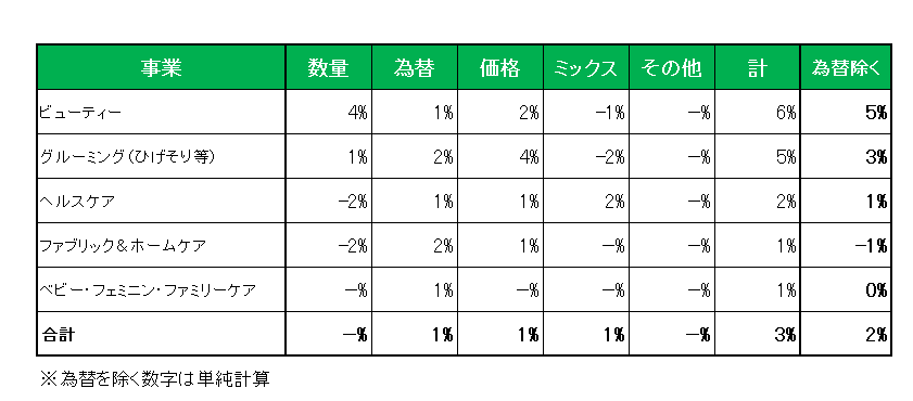 これを見ると特にビューティー、グルーミング部門が牽引、為替(ドル安)の影響もありすべての事業セグメントで増収となっていますが、為替と価格(値上げ)はそれぞれ+1%とそれほど大きくなかった状況が見て取れます。