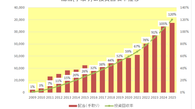 投資回収率とは、総配当受領額(税引き後)の総投資額に対する割合のこと。