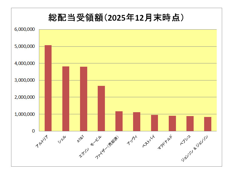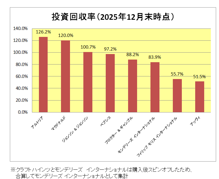 こちらは円ベースで投資回収率が50%を超えた8銘柄となりますが、1位のアルトリア(MO-126.2%)と2位のマクドナルド(MCD-120.0%)の2銘柄が100%超えとなったのに続き、今年は新たにジョンソン&ジョンソン(JNJ-100.7%)が仲間入りとなりました。