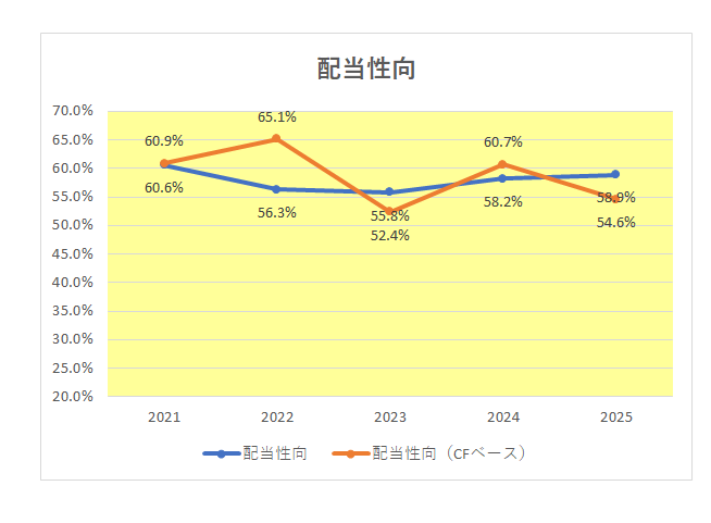 また、配当性向はPLベース、キャッシュフローベースともに極めて安定しており無理な配当支払いとなっていない。