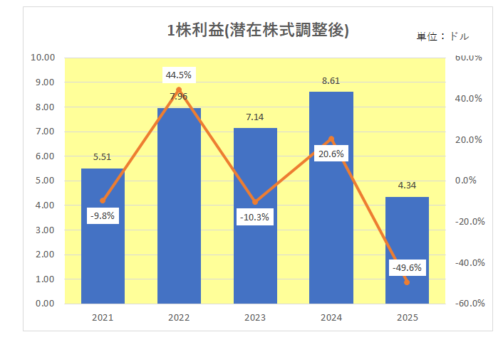 特にカカオ豆価格暴騰の初年度の2024年の1株利益は+20.6%と大幅な増益となっている。