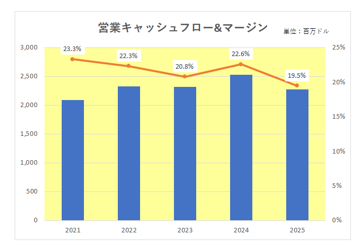 こちらは同期間の営業キャッシュフローマージンの推移となりますが、確かに2025年の数字は下がったものの1株利益のような大幅な減少は見られない。また2021年以降の期間においてカカオ豆価格如何にかかわらず営業キャッシュフローマージンは20%前後の極めて安定した数字となっていた。