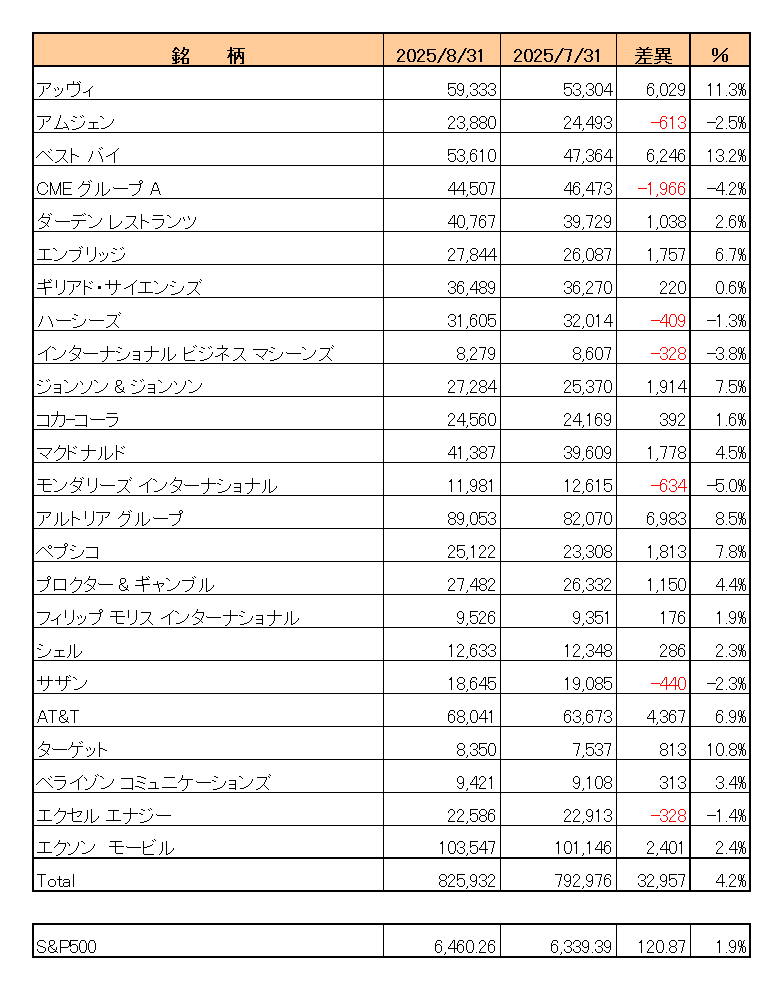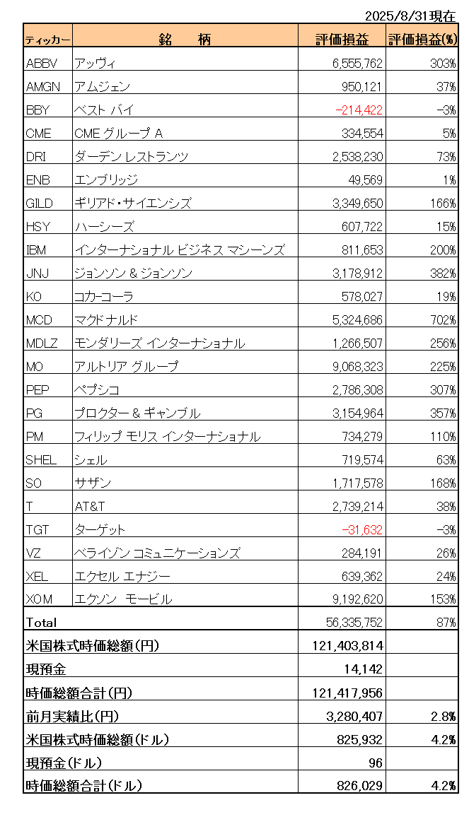 早速ですが以下のとおり2025年8月末時点の米国株の実績を公開します。
