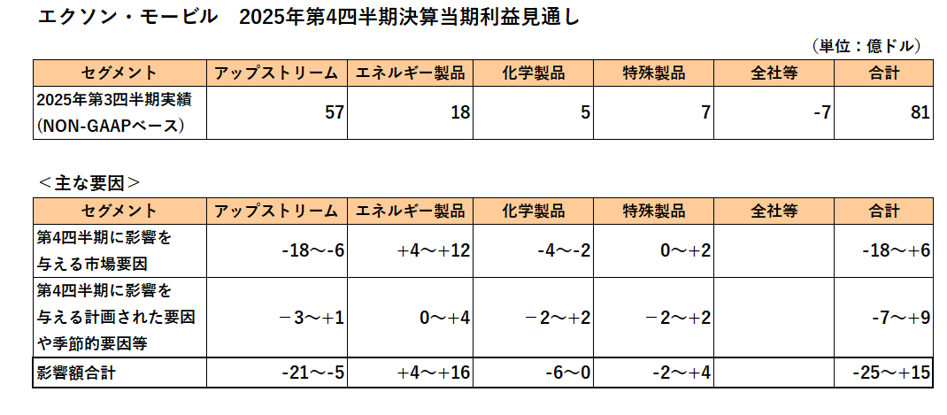 エネルギー大手のエクソン・モービル(XOM)が現地時間の1月7日にForm 8-Kを提出し、2025年第4四半期の利益見通しを開示しました。